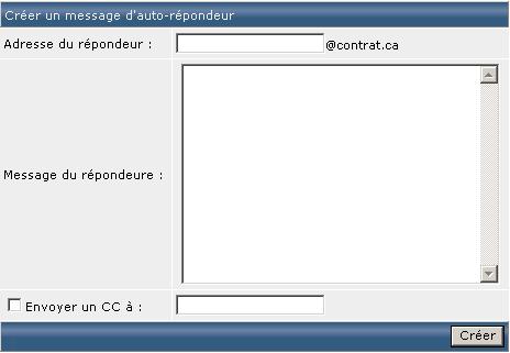 Plusieurs raisons peuvent vous amener à utiliser la messagerie "Auto répondeur". Il s'agit d'une adresse courriel virtuelle (à saisir dans le champ "Adresse du répondeur") qui sera simplement utilisée pour envoyer le message défini dans "Message du répondeur" à l'expéditeur du courriel. Si vous souhaitez recevoir une copie du courriel, vous devez cocher la case "Envoyer en CC à" (Copie Cachée) et y inscrire l'adresse courriel de votre choix :