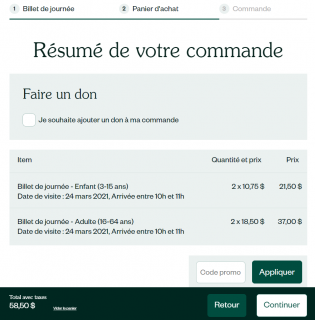 Le chemin transactionnel flexible permet, selon le contexte, de proposer une combinaison de produits. Par exemple, le système peut proposer séparément les billets, les abonnements et les certificats cadeaux, mais il peut également proposer ces mêmes produits dans un chemin transactionnel commun. Cette flexibilité permet à votre entreprise de bien diriger sa clientèle afin de faciliter et limiter autant que possible le nombre d'étapes que doit franchir le client avant de procéder au paiement.