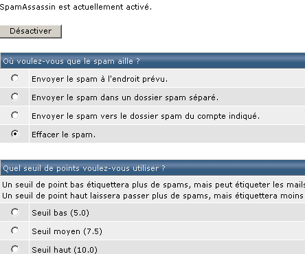 Cette section vous permet d'activer ou de désactiver Spam-Assassin. Ce filtre de courrier indésirable vous permet plusieurs options: