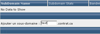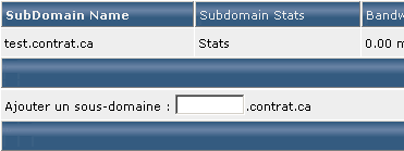 Lorsque le sous domaine est créé, il apparaît dans la liste "SubDomain Name". Vous pouvez alors accéder aux statistiques de ce sous domaine en cliquant sur "Stats" dans la colonne "Subdomain Stats" (les statistiques ne sont générées qu'au bout de quelques heures après l'utilisation effective du sous domaine), voir la consommation de bande passante en Mo dans la colonne "Bandswidth Usage" et consulter les logs d'usage ou d'erreur du sous domaine (plus d'informations sur les logs) :