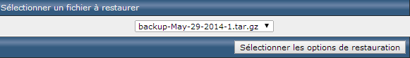 Ensuite, vous devez retourner dans la section "Créer/restaurer une sauvegarde" et, dans le bas de la page, vous allez voir une section "Restaurer une sauvegarde" avec une liste déroulante des sauvegardes présente dans votre hébergement. Il suffit de choisir la bonne sauvegarde et de cliquer le bouton "Sélectionner les options de restauration".