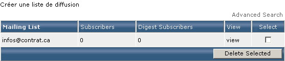 Les listes de diffusions existantes sont affichées dans le tableau "Mailing List". En cliquant sur "view" on accède à la liste de diffusion :