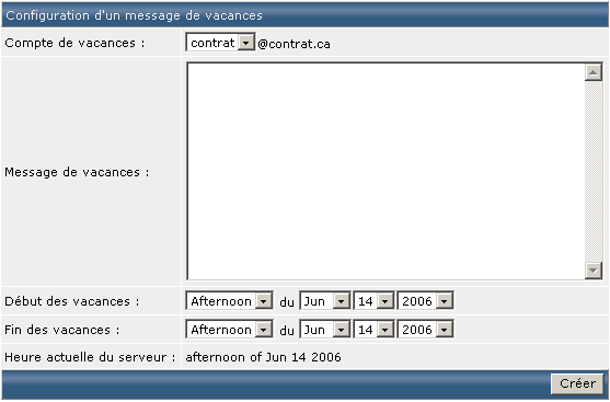 Une fois sur la page de saisie du message de vacances, vous devez sélectionner le compte courriel qui est "en vacances", saisir votre message et sélectionner les dates de congés. Si une personne écrit sur votre compte courriel durant la période de vos congés, elle recevra automatiquement le courriel que vous avez configuré. Sinon, aucun courriel ne sera envoyé. Dans les deux cas, le courriel de l'expéditeur vous parviendra sur le compte courriel :