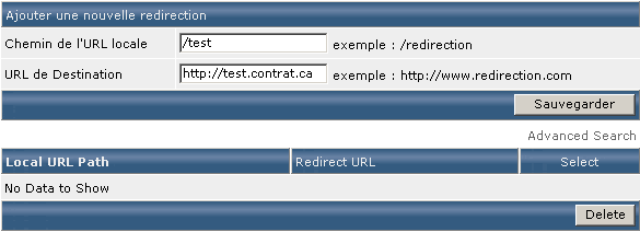 Si vous souhaitez forcer les visiteurs de votre site à accéder à certaines parties de votre site par une url particulière vous pouvez "Ajouter une nouvelle redirection". Le "Chemin de l'URL locale" est l'emplacement du dossier sur votre compte à partir de la racine du dossier public_html (emplacement de votre site) et vous devez indiquer l'url vers laquelle la redirection sera effectuée dans le champ "URL de Destination". Validez en cliquant sur "Sauvegarder". Pour supprimer une redirection, vous devez la sélectionner et cliquer sur "Delete" :