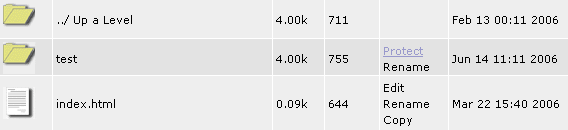 Vous arrivez à la racine de votre répertoire /public_html ou est publié votre site. Si vous souhaitez protéger un répertoire, (dans notre exemple le dossier "test") cliquez sur "Protect" dans la colonne Action sur la ligne de ce répertoire :