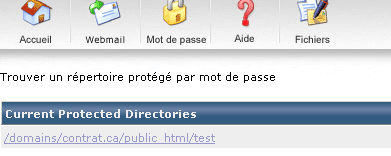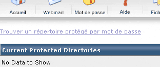 Cette aide vous permet de voir comment protéger un répertoire par un fichier .htaccess afin de restreindre les accès aux fichiers du répertoire ainsi protégé. Dans la liste "Current Protected Directories" nous voyons qu'il n'y a actuellement aucun répertoire de protégé. Nous allons donc "Trouver un répertoire protégé par mot de passe" afin de protéger un dossier :