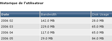 Vous pouvez voir, par date, l'évolution de votre consommation en bande passante et en espace disque. En cliquant sur le titre des colonnes, vous pouvez modifier l'ordre de classement de cet historique, respectivement par date, bande passante et espace disque :