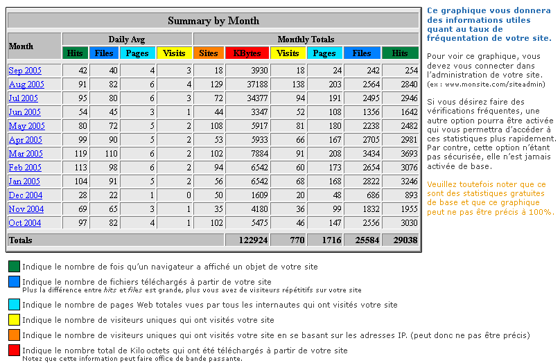 La lecture des statistiques est assez simple. Le programme Webalizer est en Anglais mais vous pourrez facilement distinguer le nombre de requêtes générées par votre site (Hits), le nombre de pages vues (Pages), le nombre visites (Visits), la consommation (KBytes), ... et le tout par an, mois, jour :