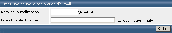 Si vous souhaitez effectuer un transfert de courriels vers un compte extérieur, vous devez cliquer sur "Créer une nouvelle redirection d'e-mail" et compléter le formulaire en indiquant l'adresse courriel locale (celle qui renverra les mails) et l'adresse courriel de destination (celle qui recevra les mails). Pour valider cliquez sur "Créer". Si vous souhaitez modifier cette redirection il vous suffira, depuis le tableau "Forwarder", de cliquer sur le nom de l'adresse courriel que vous souhaitez modifier :